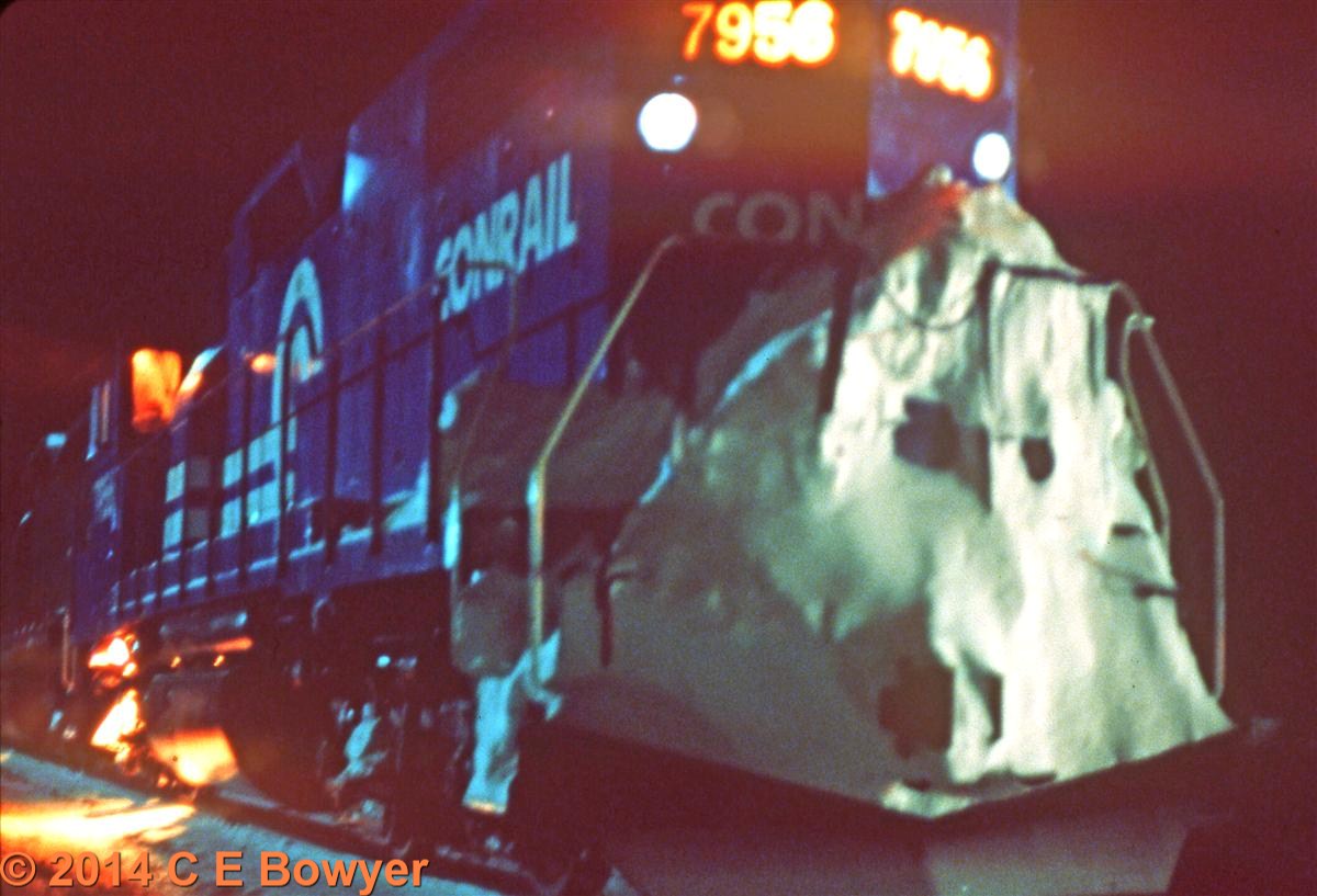 Being a lot younger, I went out later that evening and saw the first snow plow I had ever seen working through here. I heard on the radio they were going to stop in Enon Valley for a supper break so I got these rather poor pictures while the plow and locomotive were sitting.