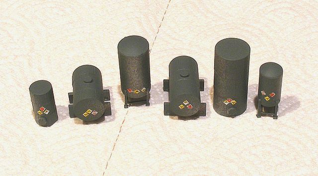 Needing storage tanks I got the assortment from Walthers. Not much to putting them togehter. Glue two halves togeter add some legs, paint, placards and dul-cote.