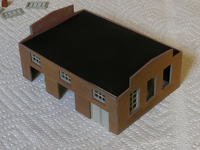 Moving on to the warehouse now. I shortened the kit to fit my space and flattened the roof to look more like the buildings we have around here. Also changing the color of the brick and doors and windows. Where there are missing windows I'm thinking of boarding those up. Still have to add window glazing, a foundation/loading dock, roof details and ....................... :hey: