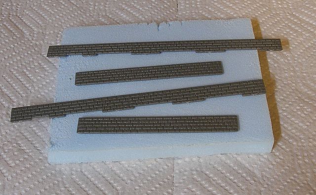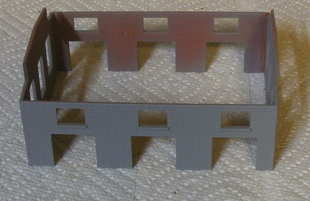 There was some stone wall pieces that came with the kit. After I shortened the building the original base no longer works so I hope using these pieces and a piece of foam I can make a new foundation. Also found some letters in my spare parts bin that maybe I can use to put the name of the company on the side of the building with.