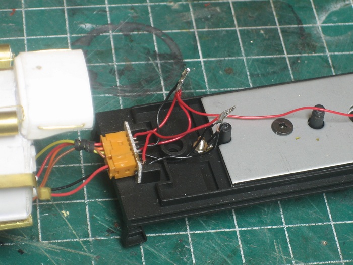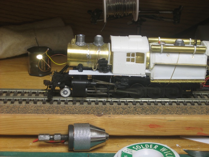 Today is boiler front day Big Grin. But before I start, I need to test my weiring,that includes continuity and polarity. On my work bench test track, if you put the direction switch to the left, forward direction will be to the left as long as everything is wired correctly. That was the first thing that I was looking for, and I discovered that one of the decapods motors were weired backwards. This was something that I was able to correct easily. I removed the PC board for the DCC hook up and hard weired all the connections in the tender flipping the polarity of the motor leads there.