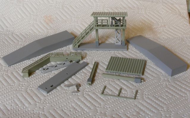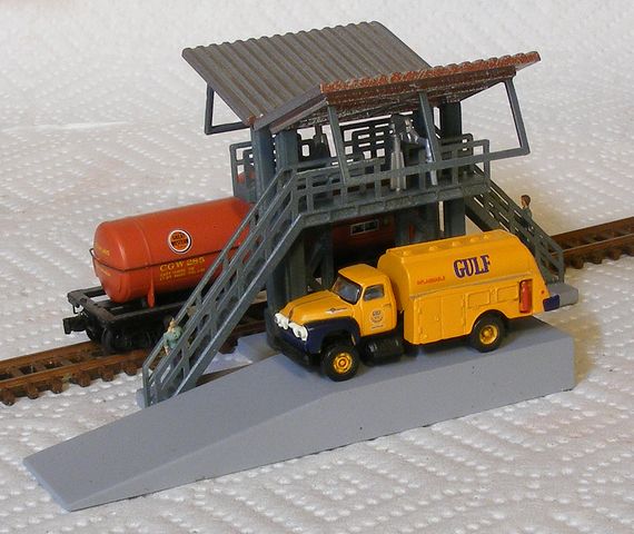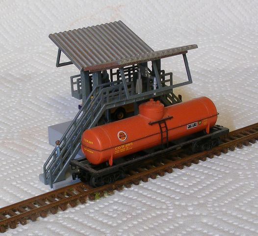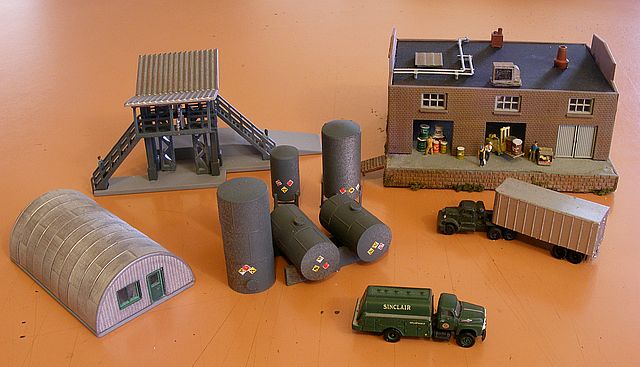 A quick update. The pic of the kit for the unloading/loading stations with one stuck together before painting. Pics after they were done and a pic of everything I have so far for my oil dealership. Not shown is a bunch of chain link fencing that I have from Gold Metal Models.