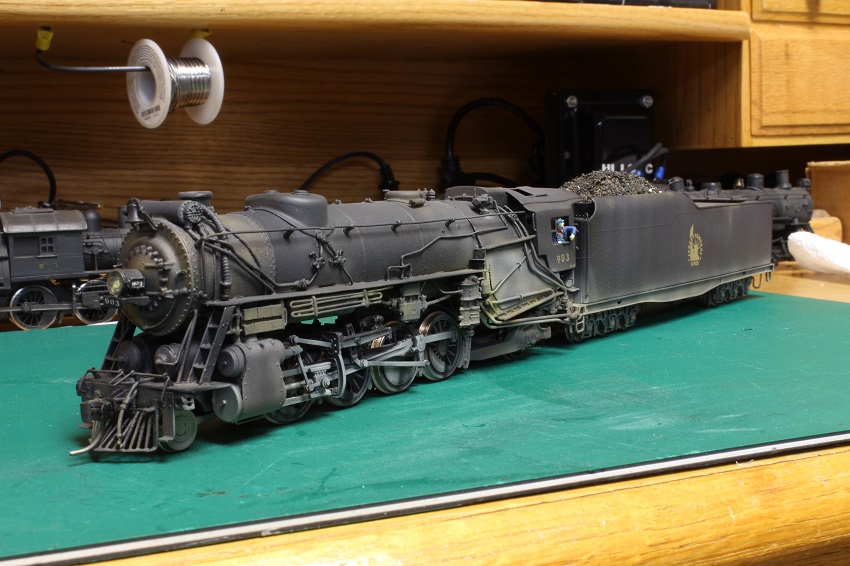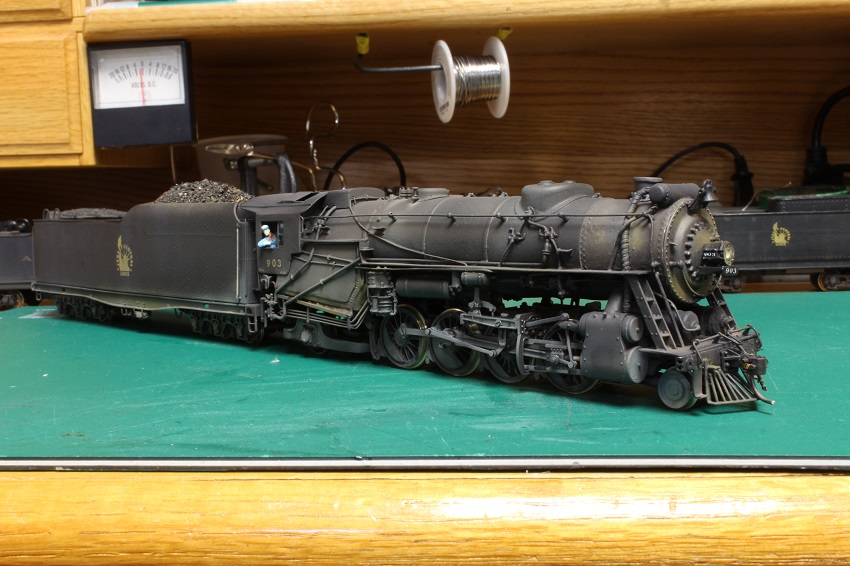 Crew installed, window glass is in, cab reattached, boiler mounted , weathered, coal load in, and test run.