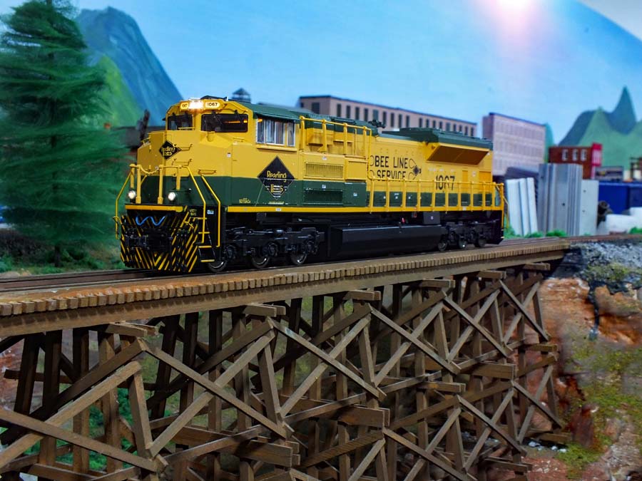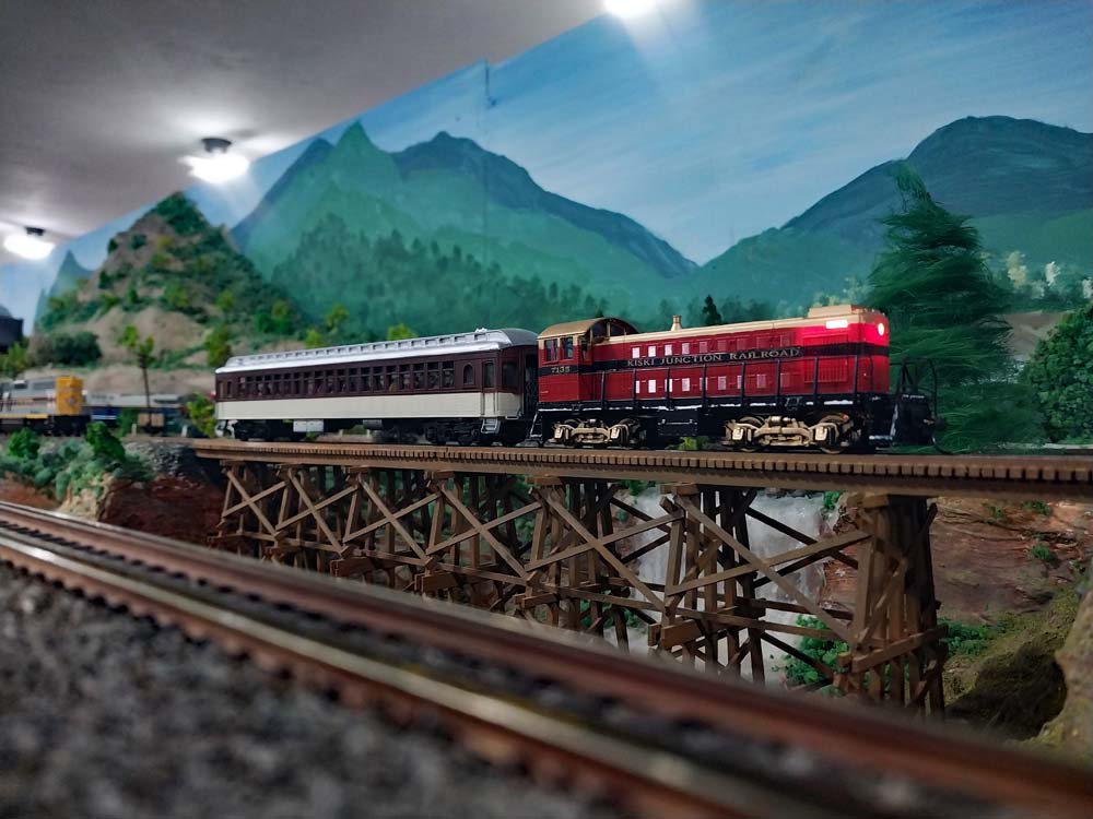 I always enjoy your layout photos. Your backdrops really add to the scene. Heritage unit looks massive! and that's a nice trestle too. That caboose looks brass? --hillyard
