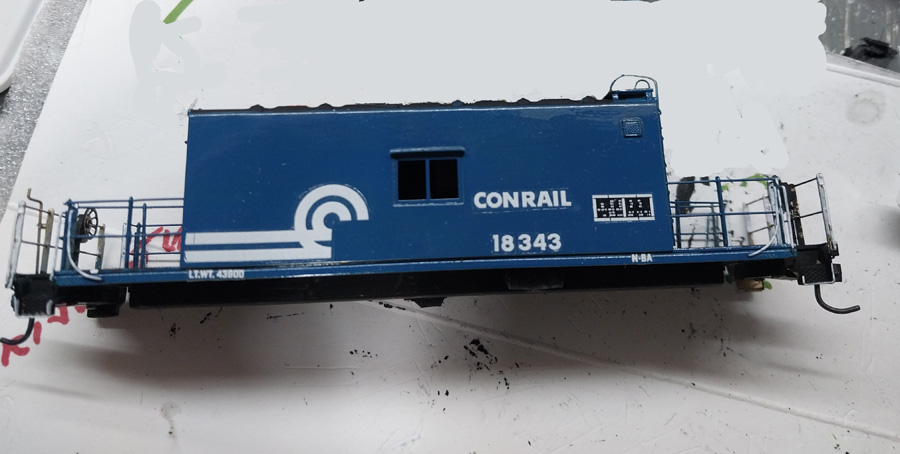 I didn't have a productive day but I did do the decals on one side of the transfer caboose that was at the Kiski for 20 years. We got it for a good price from Conrail and I sold it to my best engineer. We had it fixed up nice inside so volunteers could stay overnight if need be. I am going to leave it as a Conrail unit. It was sold along with the other cabooses to a fellow making a caboose motel in Freeport Pa.