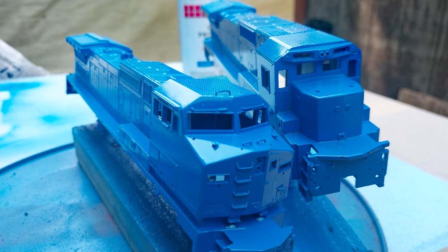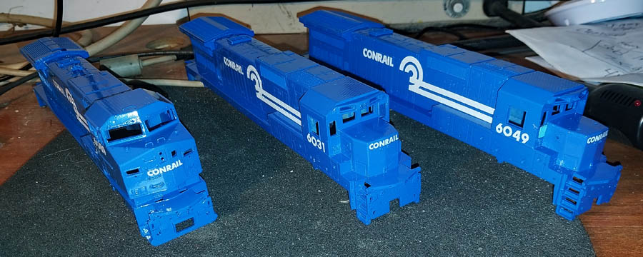 I got the bodies cleaned up yesterday and the paint has been applied. I compared the Conrail Historical Society paint chip to the Rustoleum sail blue gloss. Close enough because the paint faded to many blue shades over the years.