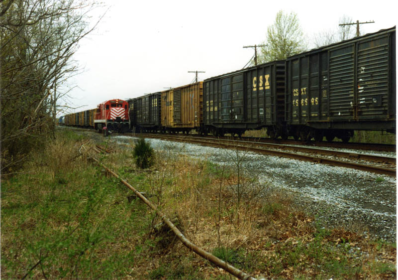 Southern RR of NJ U30B 2884 makes it's way down to the interchange track at Winslow, as Conrail WPCA-51 heads back to Camden, NJ, April 1993.