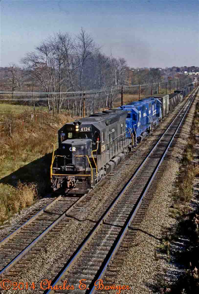 A westbound Conrail SD45 leads a manifest train at Neeld Road, East Palestine, Ohio November, 1977     Charlie
