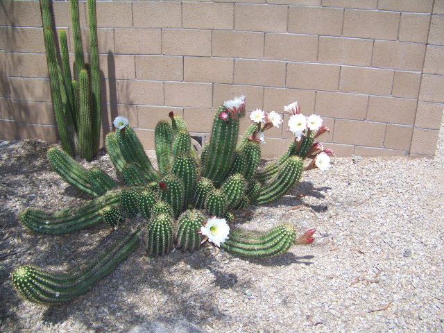 We are getting close to the time when the cacti blooms. The blooms last just one day, then fall off and another group may bloom a few days later. This is a cactus that was planted about ten years before this photo was taken. It was in the side yard of a house we sold about ten years ago so I have no idea what it looks like today. At one time I counted 15 flowers booming on it at once. BTW, most cacti do not require any extra water, I have several large ones in my front yard now and the only water they get is when it rains. So it's true, if you are stranded in the desert without water, you can cut into a cactus to get life-saving moisture.