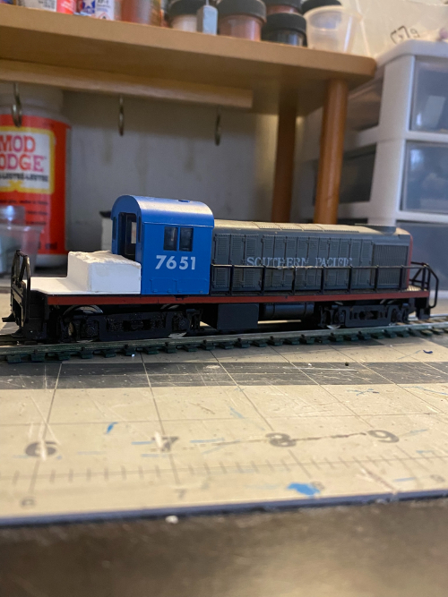 While I was waiting for the joint compound to dry, I went and glued the new headlight on the long hood end and left that dry. I also pulled out one of the two shop switchers Conrail X481. X481 had some work done to it which was to close both ends up and get them ready for paint along with the frame. You can see X481 in the background in the picture below.