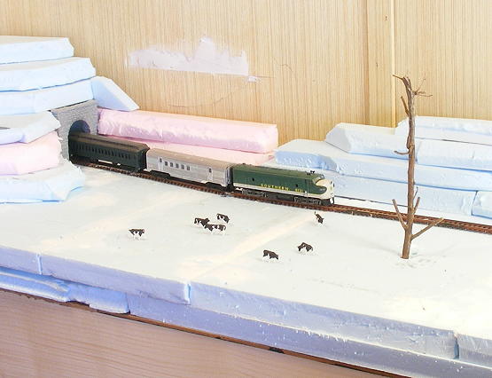 Thanks Gerd and I'll keep an eye out for the updates on your layout. Here are a few progress shots. I've cut the hole in the wall that will hopefully one day lead to phase 4 ( I'm currently working on phase 2) of the layout. The little black in white specks are dairy cows. In real life what is now just a plain field along side the tracks was during my era a dairy farm. I could also go with corn or tobacco just as well, I haven't made my mind up yet.