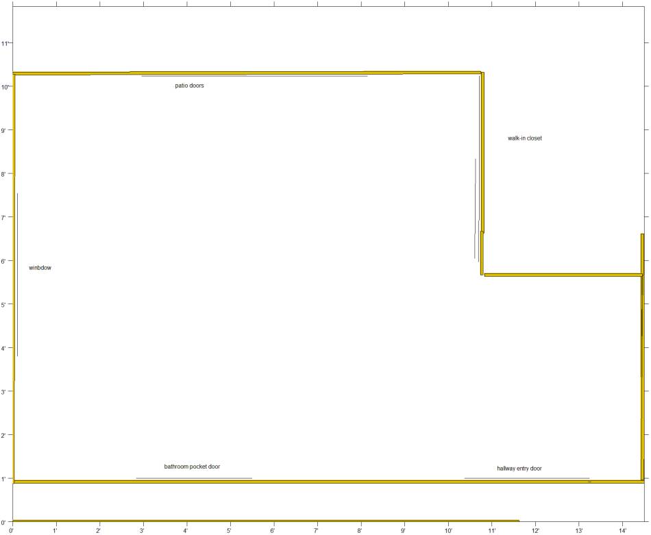 It contains four doors, an entry door, a pocket door to a bathroom, a set of double-wide closet sliding doors and a set of patio doors. The only long wall not pierced by other openings is home to a 45" window, and the entry door opens into an alcove formed by boxing off the space needed to form the walk-in closet. It would be a hard room to set up as a bedroom, but trying to envision it as a 'layout room" is taxing my mind to the utmost, despite the dimensions being a healthy 14.5' x 12'.