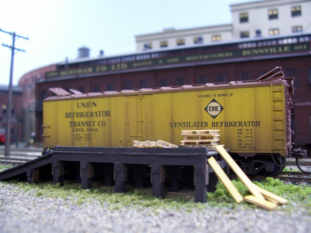 Dunnville, where most of these pictures were taken, also boasts an overhead crane, for unloading heavy or bulky cargo. (The model is by Kibri, I think)
