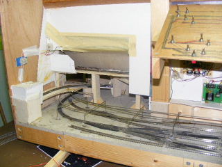 The layout size is 5ft long x 2ft wide and 14in height sp;it down the midddle with a fiddle yars able to hold 7 differant loco and rolling stock where you see the bridge we have a rail bus the runs automaticly to and thro. The other two lines are operated with isolation switches to stop go at station ect.mike