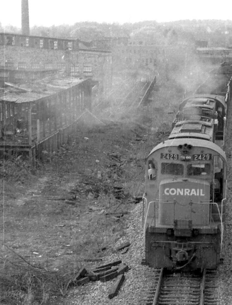 Here is another picture of a Conrail train, but I cropped it to show the unloading shed and then the trestle. The ties for the old siding are still visible. in the early 50's there were 4 main tracks and the siding on the south under the bridge I'm on. We had a beautiful station that the bank bought and tore down so they could put the ground to better use....an un-needed parking lot.