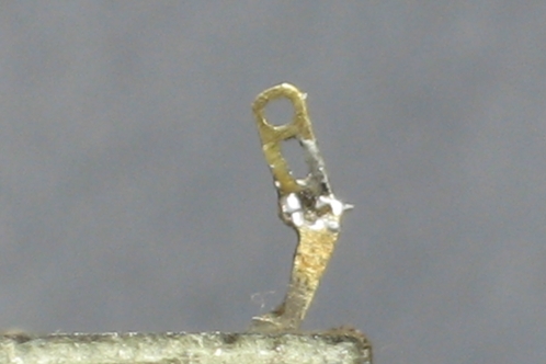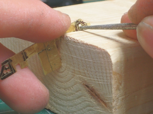 I need to cut out the centers of the roughly triangular portions of the hanger so I drilled some small holes in the aria that I have to remove and then I'll file the rest out. So that I don't destroy the thin brass I took a block of wood and cut a slit in it with a razor saw. I can slip the hanger in it and it will hold the hanger nicely so I won't mangle it as I file.