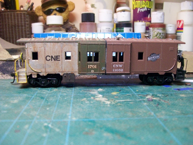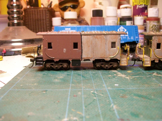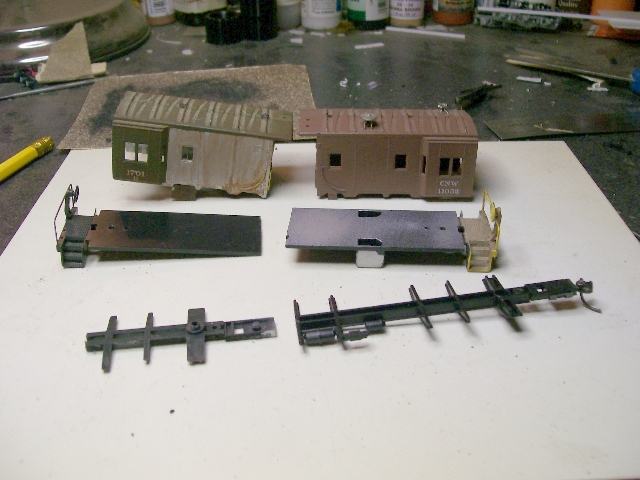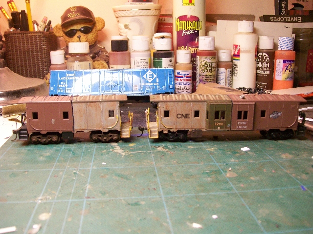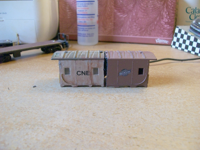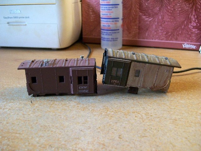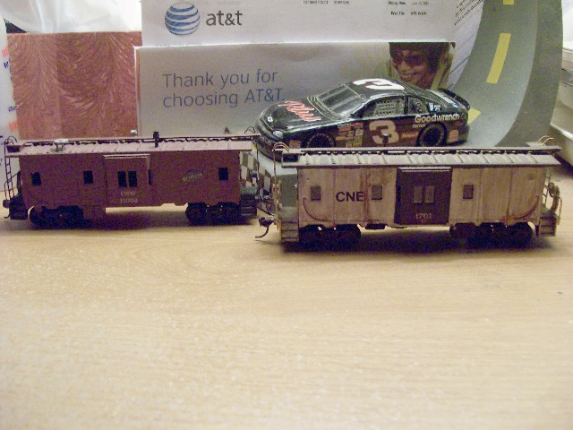 I'm starting with these two bay window cabeese. The one on the left, is a show "bargin box" find. The one on the right is CNE's first caboose. Since this unit is old, and never see's action...Pretty much shelved.