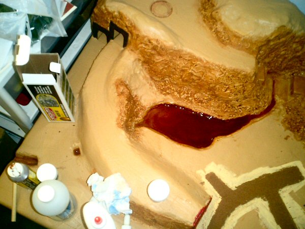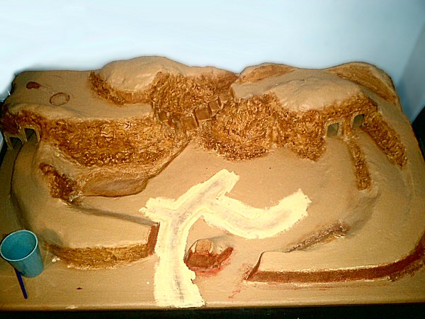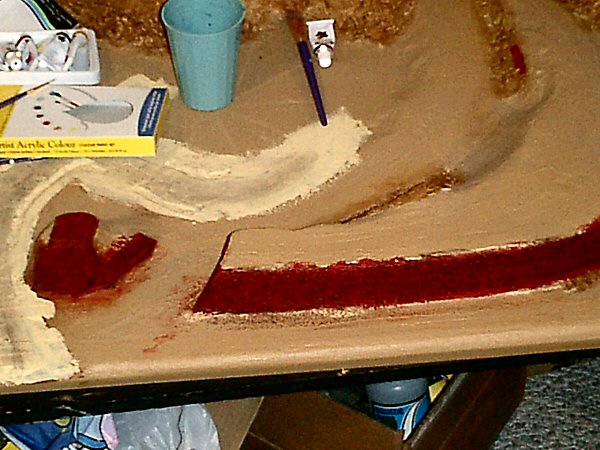 You'll note the light streak of paint through the middle of the layout..... I messed up on the dirt road color and covered it up.