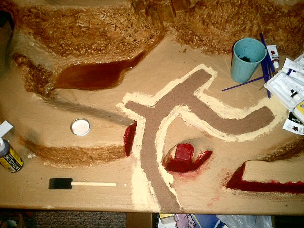 Looks like a good start. For roads I usually paint a layer of brownish latex paint then sift on some baseball diamond dirt ( unbaked ) let dry vacuum off excess dirt then another layer of paint and keep going till you get the correct suface.