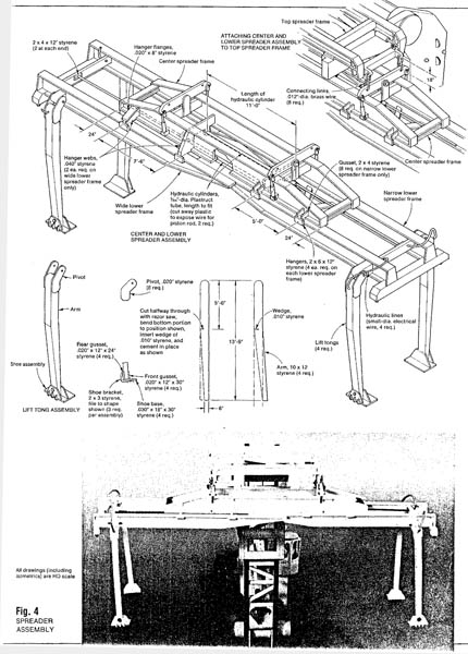 Here's a scan of the completed model from Intermodal Modelers Guide vol 1. He references the Jan/Feb 1986 Model Railroading for photos and drawings of the model, unfortunately I don't have the mags that far back. He kitbashed an old Lima Models piggypacker and then scratchbuilt the grapples.