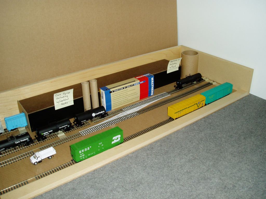 The next siding is for bulk liquids. First we have some space to store extra cars. Then there are two unloading spots for corn syrup. Finally there is a spot for one vegetable oil tank car. There is a crossover from the main line to access this spot if the corn syrup cars are being unloaded and can’t be moved when a vegetable oil tank car needs to be spotted. (Again to keep things interesting)