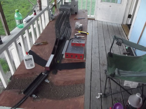 Im out for a summer and well crappy weather layout, Its built on 2x8 sheets of foam 1inch and 2 inch. The railroad is set to be a 2nd class shortline road that is served by conrail interchange track at Kenwood and via car float at Hudson Bay. The HBL has industries at Huson Bay that consist of Hudson harbor, Remington foundry and Hanlin casket co. Kenwood consists of Midtown construction, Team track, Moore & company and the MRH cerial factory. Here also is the engine and car grounds. Recently the HBL bought an abandoned line from the Short Creek Line that has 2 industries Burton chemical and Jade coal. So with this said you can find a spot set out a chair and prepair to see just about any rail car pass by you and if rail action is slow you can drop a line in the two creeks in the area and try and catch big Wally.