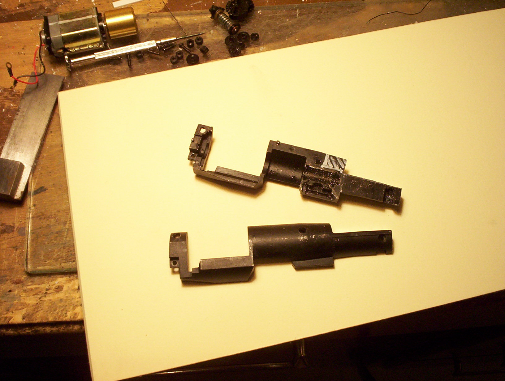 Now you need a coarse file to shape the rough casting: any will work, but I've found that the type used in autobody work is the fastest. Clamp the rough casting in a vise for this. You need to shape the back end of the lead so that it mates with the front end of the modified stock weight, and adjust the diameter so that the assembled pieces will fit into the plastic boiler casting. File and fit until satisfactory, then thoroughly clean the stock weights with soap and water to remove all grease, oil, and filings. Reassemble the motor/drivetrain assembly back into the modified weight, paying attention that the depressions on the edges of the plastic bearing retainers face to either side, with the protruding nubs oriented vertically, so as to be trapped between the halves of the weight. The plastic spacer with the smaller flange installs between the halves of the weight at the upper rear of the motor.