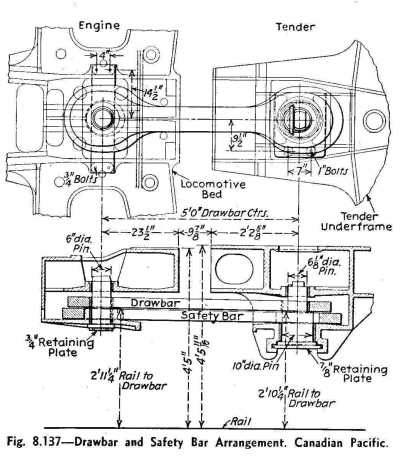 here is a drawing out of the 1947 locomotive cyclopedia showing the draw bar and safety bar this what most loco's had there are variations though..