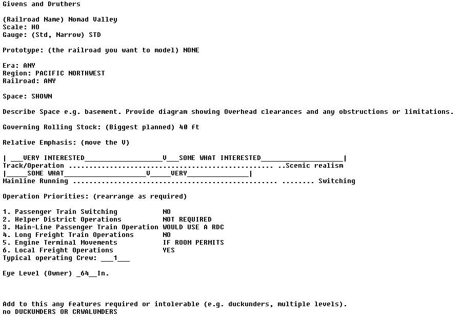What is you design vision ? I mean - those questions by Byron are actually pretty good at making you consider your goals and desires and write them down. Someone else can help you with the track plan (the how), but you first need to describe your goal (the what)
