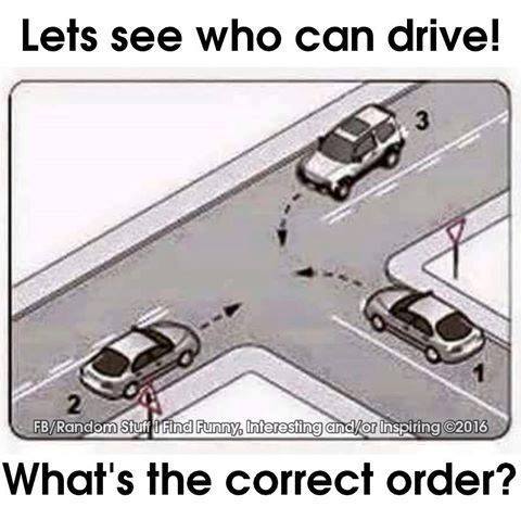 - Driver 1 has just had a loud argument with his wife who caught him messing around with the hot babe next door . He is eating a Big Mac and fries , drinking a Slurpee and hitting the search button on the car radio in an effort to find a suitable Black Sabbath song to fit his mood . -Driver 2 - Recently moved from England and is finding the adjustment to driving on the right side of the road a bit of a challenge . He is texting those feelings , right now , to his wife and is balancing a scalding hot coffee on his leg . Driver 3 - Has just been discharged from the Marines and has his girl friend sitting beside him . ......hasn't seen her in 3 years .....she is rubbing his leg while whispering in his ear what she is going to do to him when they get to the hotel .....or maybe the nearest field . .....Sooooo ,in what order do the three drivers proceed ? ![]() ![]()