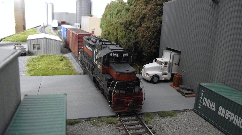 and the 623 entering the 'urban canyon' at the right hand end of the layout.