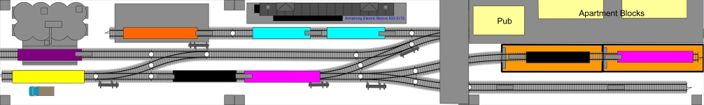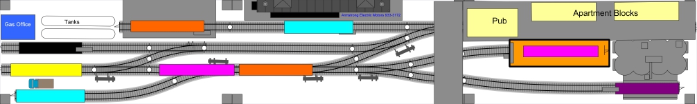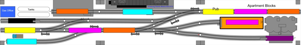 There is a hidden siding under the Pub and Apartments, which is big enough to hold the loco and the two longest of the wagons.