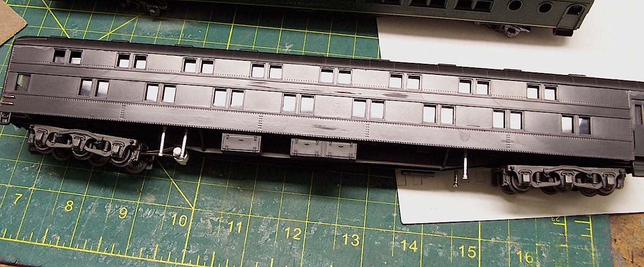 The two 8-1-2 cars, plus the duplex sleeper, and the postal car are ready for a coat of primer, and the baggage car which lacked underbody brake gear, will likely get those details painted with a brush.