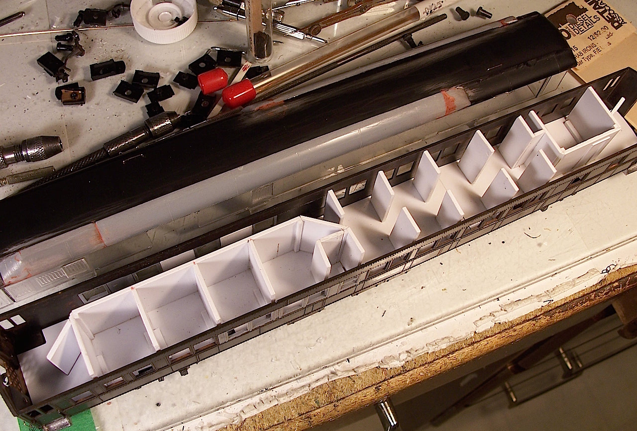 Here's a view of the rudimentary interior....both cars will eventually get seating in the sections, but I won't bother with details in the rooms