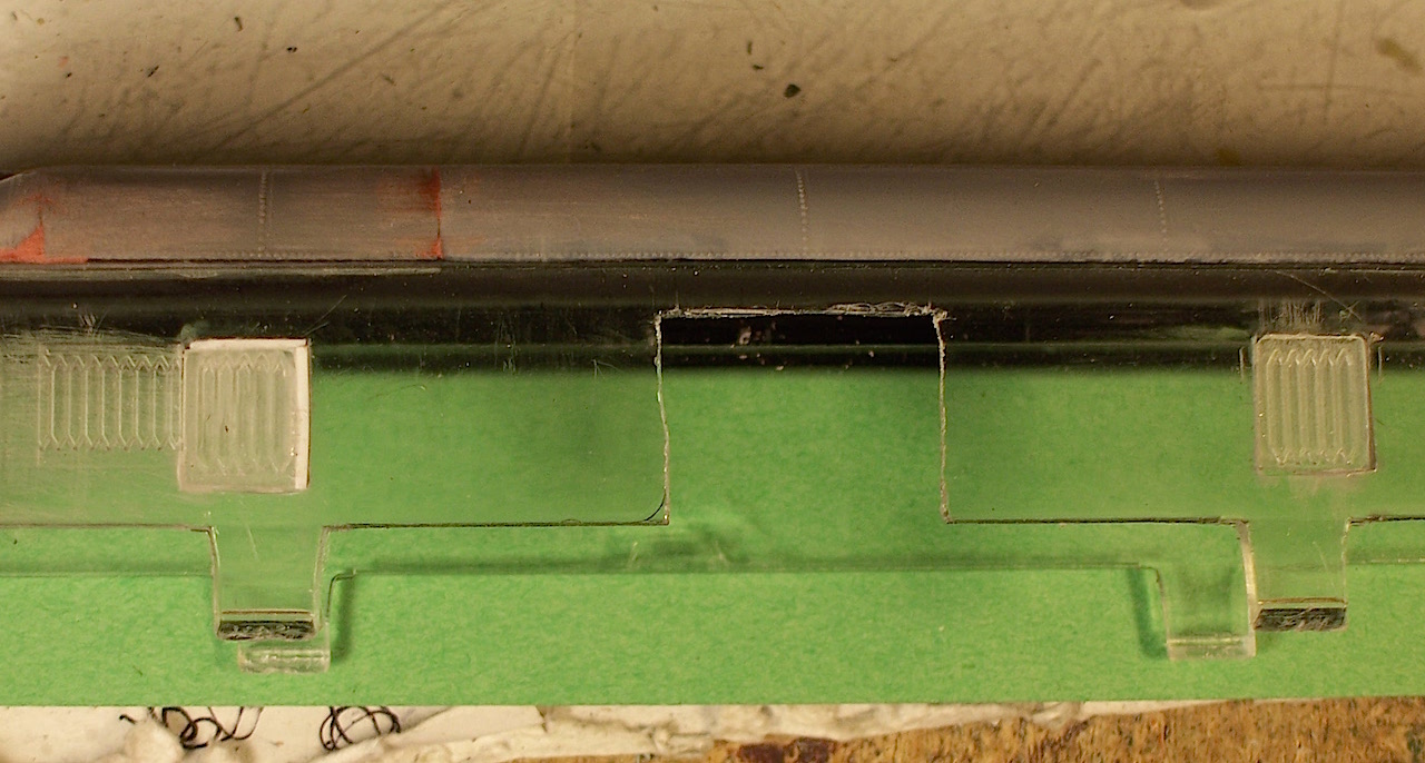 This view shows a couple of washroom windows (salvaged from other Rivarossi passenger cars) that were grafted into the window-portion of the Rivarossi roofs, due to the different interior layout - the one on the left is for the ladies washroom/lounge, the one on the right for the private washroom in the drawing room.  The missing window segment had flaws and will be added separately, directly to the inside of the car, after the car is painted and lettered.