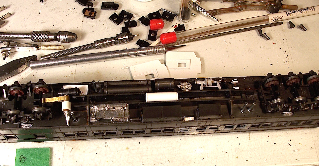 This is the duplex sleeper, which has fairly deep sidesills.  That would make most underbody detail visible only when the car derails and rolls-over.  Because of that, added detail is minimal.  Here's the main addition, a belt-driven generator, which, on the real cars runs the lighting and other electrical-operated amenities, in addition to keeping the underbody batteries fully charged...important when the car is not in motion.