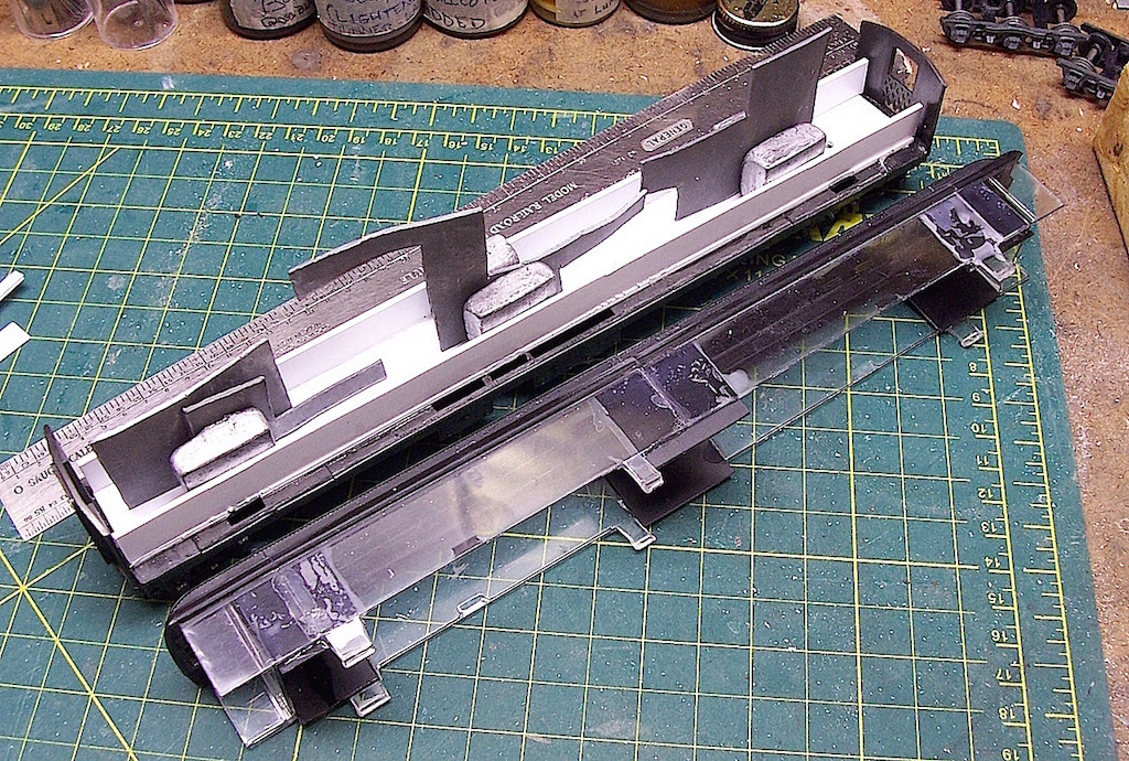 Here's the floor cemented together, with two .060"x3'(HO) strips of styrene to stiffen the multi-piece floor...(the lead weights are there only to hold the stiffeners vertical while the glue sets, although I will be adding permanent lead weights before the car returns to its owner.
