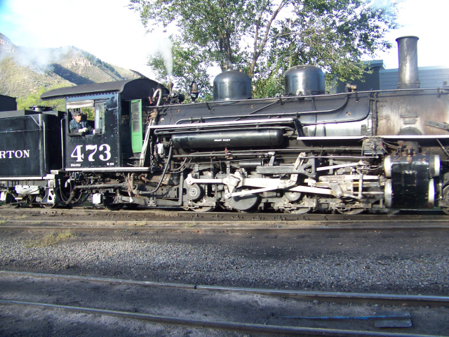 We left Durango as a double-header (480/473) steam until we got to the top of hill and took on water, then 480 went ahead because of the weight restrictions on one trestle. We then went double-header into Silverton. On the way back, 473 took us all the way. We followed the river and at one point was 400 feet above it, and many times was so close to the edge, all we could see when we looked down was water. In many places, the rocks were shored up by old rails and bailing wire. At one point the engines let off steam. Seems like they use river water and need to get rid of the sediment that collects in the boiler.