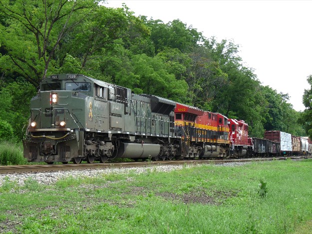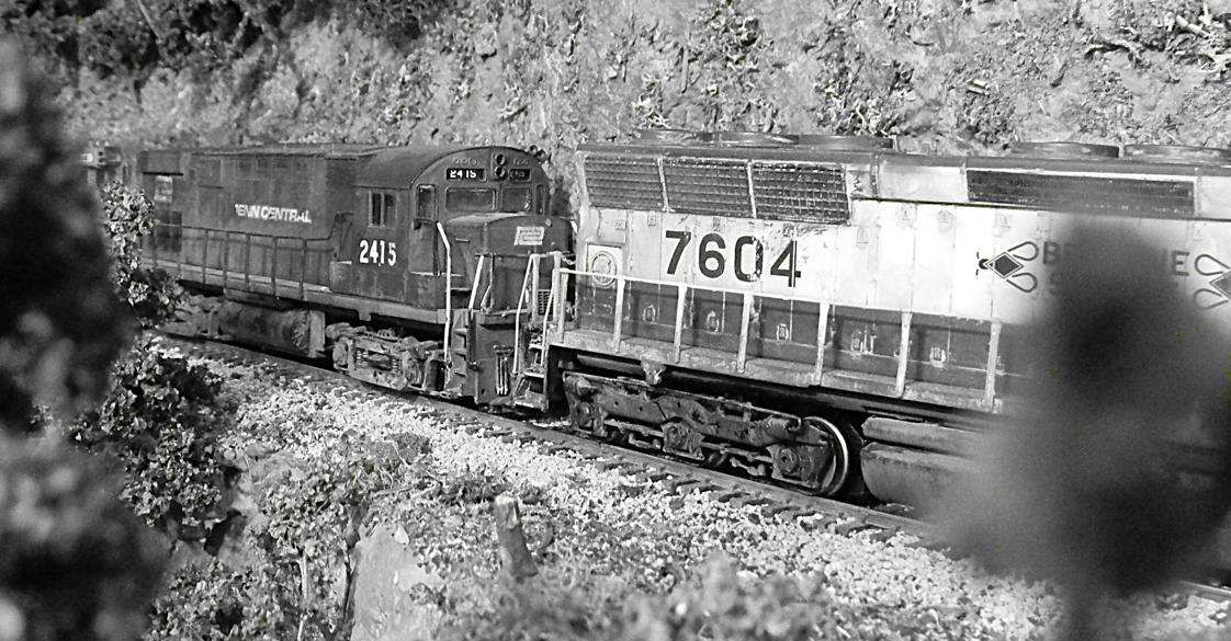 Todd - Nice black & white shot. Penn Central SD45 locomotives (Walthers Proto) rounding the curve by the coal dealer, ![]()