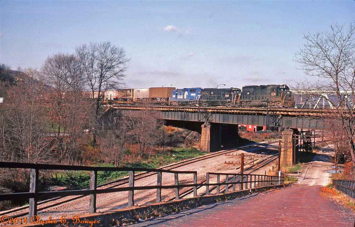 RE: Trains on this day in the past: - doctorwayne - 11-18-2018 Charlie, that road alongside the track looks like it would be pretty good for a pacing video, at least until you got to the stop sign. Wayne RE: Trains on this day in the past: - Charlie B - 11-18-2018 (11-18-2018, 11:52 AM)doctorwayne Wrote: Charlie, that road alongside the track looks like it would be pretty good for a pacing video, at least until you got to the stop sign. Well, it's only about a block or 2 long so you would have to be fast. RE: Trains on this day in the past: - cn nutbar - 11-18-2018 18/11/2015 RE: Trains on this day in the past: - Charlie B - 11-19-2018 11/19/1977 Beaver Falls, Pa. The bridge behind the track was replaced in 1985, and the one I took the pictures from was removed in 1995. The track under Conrail was the P&LE, now CSX. Charlie RE: Trains on this day in the past: - doctorwayne - 11-19-2018 I sorta recognise that place , Charlie, but I also don't quite recognise it, either. Where's our usual locale relative to the CSX tracks in the photo? Wayne RE: Trains on this day in the past: - Charlie B - 11-20-2018 Wayne, We can't get to that area any more because the road is closed just past the hydro plant where I worked. This screen shot should help you get your bearings. We usually see that bridge from the other side. charlie RE: Trains on this day in the past: - Charlie B - 11-20-2018 November 20, 1976. The heritage of this locomotive show clearly in New Waterford, Ohio. RE: Trains on this day in the past: - bdw9535 - 11-20-2018 Winslow, NJ, November 1992 Bruce RE: Trains on this day in the past: - doctorwayne - 11-20-2018 Thanks for that explanation, Charlie. The aerial view really makes it understandable. Also, another thanks to you, Bruce, and Ed for your regular contributions to this thread. Wayne RE: Trains on this day in the past: - cn nutbar - 11-21-2018 21/11/2017---CN train 148 eastbound at Bayview RE: Trains on this day in the past: - Charlie B - 11-22-2018 11/22/2009, Aley Hill Road, just west of Homewood Jct, Pa. HAPPY THANKSGIVING. Charlie RE: Trains on this day in the past: - cn nutbar - 11-22-2018 Happy Thanksgiving to all our friends south of the border 22/11/2017 RE: Trains on this day in the past: - Charlie B - 11-24-2018 11/24/2003 A Photo stop at MP 2.5 on the KJR. The Kiskimenitas River and the NS/former PRR Conemaugh line in the background. Charlie RE: Trains on this day in the past: - Charlie B - 11-26-2018 111/27/2017, Enon Valley RE: Trains on this day in the past: - Charlie B - 11-27-2018 NS train 16G at the James Street crossing in East Palestine, Oh. 11/27/2015 |