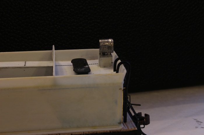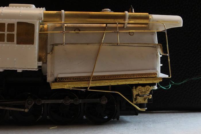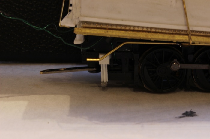 E-paw's duff challenge for 2013 - e-paw - 02-17-2013 Almost there,,,,, I have moved on to the tender lighting. I drilled out the bottom of a Shelly Castings headlight to fit a small LED. This will provide me with directional lighting . In order for the light to clear the read lip of the tender the SH&D crew had to build a simple stand from styrene to mount the fixture to. I insulated the LED leads with some liquid electrical tape. The lights were mounted on the tender deck just right of center. From there I moved on to the rear railings for the firebox walkways. When your finished you end up with a nice set of railings E-paw's duff challenge for 2013 - e-paw - 02-17-2013 I mounted the railing in place by soldering them to the walkways.. This underside shot shows the attachments a little better. The last detail that I wanted to add was the magnetic impulse collector coil. This futuristic sounding device is what picks up the signals from the rails for the automatic train stop system. Now the 2-10-0's are ready for paint. Here they are sitting at the east end of AT yard where they will be assigned. Re: E-paw's duff challenge for 2013 - tetters - 02-17-2013