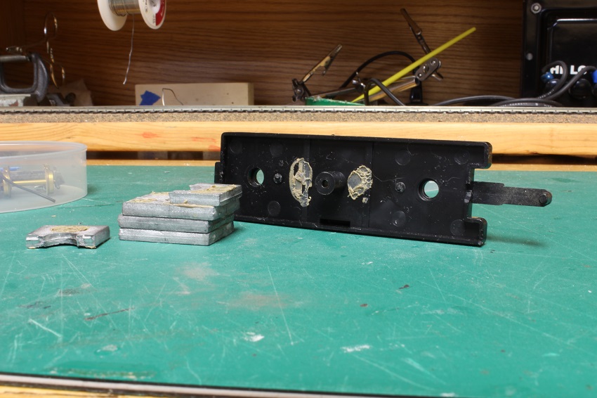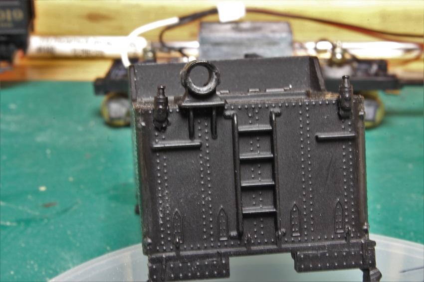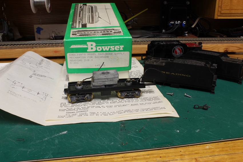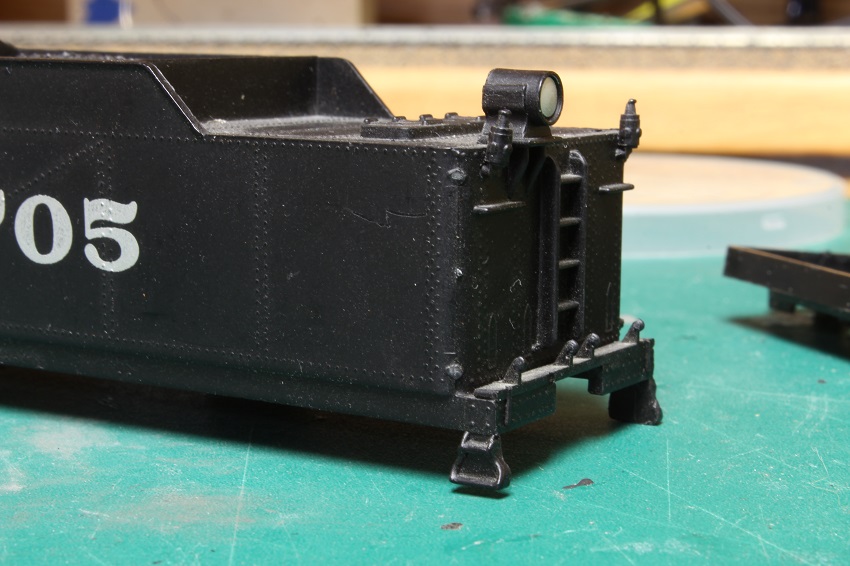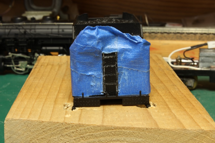 Re: "TENDER TUESDAY" - e-paw - 08-15-2017 Yep, one of the I 10's Mark. do you have any of the Bowser repower kits for them ? I had a lot of trouble locating one. I was relay trying for an unbuilt one, but was only able to pick up one that was fiddled with. I haven't picked out one in particular yet, but I am leaning towards 1954. I thought about picking a 2-8-0, modeling that one, then modeling the T-1 that it was converted into. I would have to take pics of them double headed as a form of irony. I did a little more work to the frame, weight, and tucks. We now have all wheel pick up on this tender. I separated all the sections of the weight, cleaned off the old chewing gum like glue, and reattached them with CA so that they were as straight and even as possible. I also added two strips of PC board to act as buss bars to solder the pickup, lighting, and engine feed wires to. The PC board should help to stiffen up the frame. Re: "TENDER TUESDAY" - twilight - 08-15-2017 No Steve I don't have a Bowser drive for an I-10. I saw one come up on Ebay a month or so ago and I think that's the first one I've ever seen. So, I imagine they are pretty rare. And I didn't want to lay out the beans for it. I was going to copy a build I found on the Reading Modeler website. Where the guy uses a Bachmann Spectrum 2-8-0 drive and changes over the valve gear. I started the project a while ago but it got sidelined when I joined the get off your duff challenge. BTW, one electrician to another, I recognized those plastic containers from the 3m tape as soon as I saw them Mark Re: "TENDER TUESDAY" - e-paw - 08-16-2017 I use those plastic containers for everything mark. I managed to get that conversion kit for about 60 bucks with the shipping. That seems like a good deal as I have seen the ending bids as high as $150, then you got to figure in another 10 to 15 bucks for the shipping. I believe they went for about 70 just before they were discontinued. Re: "TENDER TUESDAY" - twilight - 08-16-2017 Yeah, the one I saw was for $99 bucks Buy It Now. I was tempted, but decided to stay with my original plan and use the Bachmann 2-8-0. Wanted a drive I wouldn't have to mess around with much when I stick a decider in it Mark Re: "TENDER TUESDAY" - e-paw - 08-22-2017 Welcome gentlemen. to yet another Tender Tuesday,,,,," Yaaaaaaaay !!!" Today I have a few more pics from the workbench of the Reading tender. But first I have something from the ARHS Yahoo group that was sent to me. It's a scan of a Reading blue print showing a modification done to the I-10 tenders that were surplus after they were converted to T-1's. These tenders ended up going to the RDG's M class 2-8-2's I have now soldered up the rest of the pickup system and installed the trucks as seen here. The backup light was drilled out for the installation of a LED lamp. All those molded on rear grabs and ladder will have to go, but I'm worried about breaking off a step or two as I work. Hmmm, what to do ? Here is my solution for detail damage control. I drilled out some holes in a scrap 2x4 that the steps and toolbox can fit into. Now the body rests on the block of wood and not on the breakable details. With some masking tape guarding against a misfortunate slip of the knife I can now carve away. Re: "TENDER TUESDAY" - cn nutbar - 08-22-2017 Vanderbilt tenders were quite common on the CNR locomotives but the ones on T2A 's were very different with their unique style