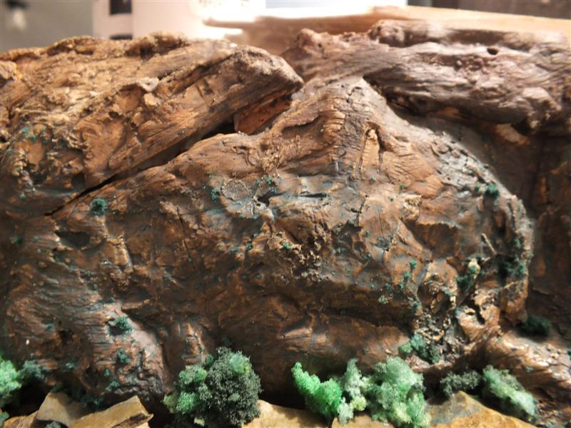 Re: Charlie b's layout - Ralph - 02-28-2013 I'm with T. The viaduct looks good in your photo! Re: Charlie b's layout - Charlie B - 03-30-2013 I have been scanning slides so the layout has taken a back seat, but it warmed up yesterday so I did some work on the cliff face on the north side of the layout. I wanted to make it look like old rock with the blue green flourescent moss. It looks good in person, but hard to photograph. I mixed blue and green craft paint with some Elmer's white glue and added some fine green ground foam, thinned the mess with window cleaner, then I brushed it on the areas that don't see much sunlight. Charlie Re: Charlie b's layout - Ralph - 03-30-2013 I'm lichen it! Re: Charlie b's layout - teejay - 03-30-2013 Ouch , Ralph ....! T |