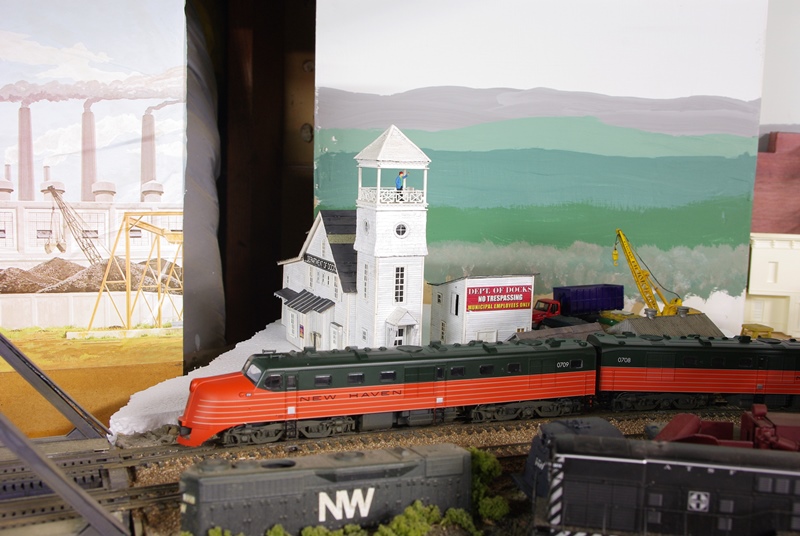 Re: Progress Shots - doctorwayne - 04-12-2013 jwb Wrote:Bay City like in The Big Sleep. That's the original, I take it. ![]() You had me worried that it was Bay City, as in "Rollers", and I don't mean British slang for an expensive ride. ![]() Wayne Re: Progress Shots - jwb - 04-12-2013 Here is the next shot just to the right of the last shot above. This is the nitty-grittiest area I have to deal with, where a European style main line comes within a few inches of a US style main line. There is a highway crossing in the immediate foreground, which will make a hard left to turn into the street that runs trackside in the photos just previous. There are parts of California that look very European, so that helps. Re: Progress Shots - eje - 04-12-2013 It is all so wonderful. Nothing else on Earth looks like California, the Golden State. Re: Progress Shots - jwb - 04-23-2013 In the spirit of a couple of other recent posts on passenger service, here's an overhead view down the main line at my Zenith Amtrak passenger station. The Amtrak station, on the right, is the Walthers model, recently revived (but this one is from the 1990s), a model of the Rochester, NY station. (Here's a shot of the prototype, early one very cold morning): This is one of the areas I've been returning to. The model roof is off as I go back to installing lighting. I need to add more paving to the area around the station. Yesterday I added the short platform to the right with the traffic cones at the end. On the to-do list will be to add Wheels of Time yellow rubber platform edge decals to this short platform, as well as another platform elsewhere on the layout. The white stuff on the center track is from a friend who was "helping" me with scenery, who spilled a rubber mold filled with not-quite-hardened plaster all over the area. This is the rest of what I need to clean up, but the end is in sight, just a lot of work with an old toothbrush. Then finishing ballast in the area and other incidental details, like more figures, platform lights, BLMA relay boxes, etc. Re: Progress Shots - jwb - 04-26-2013 The Zenith Amtrak depot had a lot of pieces fall off over the years, so I re-cemented a lot of components. I also finished installing lights: I'm happy to see that you can see the lighting when the roof is on: Now I think I may get one of those Miller Engineering flashing Amtrak billboards to go on the roof. I'd be just as happy with the sort of lighted signs that are on the prototype, but they don't seem to make those. Re: Progress Shots - faraway - 04-26-2013 That is a nice depot. Especially the roof boarder is very attractive. Re: Progress Shots - Ralph - 04-26-2013 I like it a lot too! Re: Progress Shots - jwb - 05-04-2013 I've referred earlier to the ovaloid route on my bigger peninsula that will represent either the Northeast Corridor or an electrified European (primarily German, Austrian, or Swiss) main line. I hate the wiring work I'm having to do here, but I'm making progress. The outer track of the double-track oval is now fully wired. There are crossover connections at the area illustrated with my normal US CTC-style main line, and a small engine terminal for a switcher in this area, called variously Bay City or Jaques on the timetable. Now that it's got minimal wiring, I've set up a train that takes US style freight cars onto the outer European oval and treats it, for the time being, as staging. Here's a GP38-2 going to pick up its cars off the interchange track: It picks up the two cars and seesaws onto the "Northeast Corridor", or maybe it's the "Geislinger Steige": And then disappears into a tunnel, which for the time being is the staging track, although eventually it will normally operate as a separate ovaloid from the main line. The point of these photos, again, is not to show finished parts of the layout, but to induce me to make more progress! I still need to do final leveling and ballast of the track, wire some more of the switch machines, finish wiring the inner oval and some other tracks (including a motor storage that I've mentioned in previous posts), and finally install Sommerfeldt catenary. You can see a post in the bottom photo. Re: Progress Shots - faraway - 05-04-2013 It is very unusual how you integrate US and Europe on one layout. Do I see some German train in red and cream color in the background? Looks like some TEE/IC passenger cars. Re: Progress Shots - jwb - 05-05-2013 It's the Kato DR/DDR TEE -- I forget the designation. It's worth pointing out that the Pennsylvania Railroad in particular emulated a lot of European practices, especially in architecture, although in the 19th and early 20th centuries, many mechanical people were ethnic Germans (Altoona, PA was named for Altona in Germany; the "oo" was meant to be pronounced as the German single 'o', and I believe locals pronounce it the German way) -- the two most prominent motive power heads were named Axel Vogt and William Kiesel; I believe Kiesel studied at Kiel. The K4 was Kiesel's. But it's only the one area of my layout that I try to directly combine European and US practice. However, the old Pola platform you see in the background of some shots, while very European looking, is also very typical of PRR practice. Re: Progress Shots - jwb - 05-05-2013 Here's a view of the one area where European and US stuff comes together on the layout. In the lower right is the end of the Amtrak platform at Bay City, CA. To the left is a German-style signal cabin and farther beyond is the station platform that could be either Northeast Corridor or someplace in Europe. The connecting tracks between Europe and the US are in the center of the photo. They layout is designed so that US equipment can move over European track to reach one industry and staging, but I don't intend to run European equipment on US track, as part of the US style main line is code 70 track, which doesn't work with European non-RP25 wheels. Here is the end unit for the East German TEE-