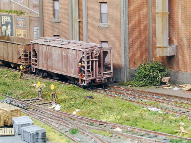 Re: 59th and Rust - Brakie - 03-06-2013 jwb Wrote:PRR steam ended entirely in 1957, with a B6sb 0-6-0 being the last. The USRA locos wouldn't have lasted quite as long, but you're safe with the early 1950s. Actually PRR used a B6sb in Columbus until mid 1958..This engine was used to moved dead steam engines and gondolas in Chase Ave yard(aka bone yard) for the scappers..The reason I know this my Uncle Charlie was the fireman assigned to that job.Sadly this B6SB was scrapped shortly after its fire was dropped.FM H10-44 9090 replaced the B6sb and yes,Uncle Charlie was still the assigned fireman.After this assignment 9090 was assign to Columbus Union Depot duties and was replaced with SW900 7913 in '64. Sorry..Didn't mean to prater on. Re: 59th and Rust - shortliner - 03-06-2013 Larry - don't be sorry - it is all too easy for us guys on this side of the pond to pick up a reference from the internet and GET IT REALLY WRONG! - getting the info straight "from the horses mouth", as it were, is what keeps the rivet counters in check, and us on the right road. Re: 59th and Rust - Brakie - 03-06-2013 Ralph Wrote:Not me! That was Larry (Brakie). I'm not sure what he was referring to. Being a former brakeman I see a major safety hazard that would get a MOW foreman in hot water and maybe a unpaid vacation.. The stack of rails is to close to the rail and in the work zone where the switchman would be working and at night with nothing more then your Starbrite lantern you may not see the rails when you swing off a car,trip over the rail,and under the car you go or you could get knock off the car's stirrup and end up injured..Its that easy.. No big thing..Its a common mistake modelers make. Re: 59th and Rust - Puddlejumper - 03-06-2013 Brakie Wrote:Being a former brakeman I see a major safety hazard that would get a MOW foreman in hot water and maybe a unpaid vacation.. Being a former trainman myself, it never occurred to me that the railroad made a concerted effort to keep the "working area" around the railhead clear. Makes sense, I just never thought of it. I'll make sure to pay attention to that when I begin scenicking the layout. By the way this is now one of my favorite small layouts ever. I love the urban feel, exactly how I want my layout to feel. Dave Re: 59th and Rust - Brakie - 03-06-2013 By the way this is now one of my favorite small layouts ever. I love the urban feel, exactly how I want my layout to feel. Dave ------------------------ Abosolutely..I love the trashy industrial look and where bricks or cobble stone is showing in the pavement.. ![]() Re: 59th and Rust - Ralph - 03-06-2013 Brakie Wrote:Ralph Wrote:Not me! That was Larry (Brakie). I'm not sure what he was referring to. One of the things I appreciate about the forum is the input from railroaders who can provide tips about prototype practice. Hadn't noticed the rails Brakie. ![]() Re: 59th and Rust - Ralph - 03-06-2013 "Puddlejumper Wrote:By the way this is now one of my favorite small layouts ever. I love the urban feel, exactly how I want my layout to feel. ![]() Re: 59th and Rust - jwb - 03-06-2013 Jack, rail is pretty common along rights of way, and it's often right where you have it. I wouldn't worry about it. Re: 59th and Rust - long island jack - 03-06-2013 Guys i'm really flattered with all the kind remarks,thanks a lot,for someone who's never been across the pond, i've had to do it all by photo's etc, it's good to get feedback from people who live on the doorstep,i'm pleased it looks the part and i hope it gives you all ideas to enhance your own model worlds. JWB thanks for the photo saves me pulling the track out,i've made a mental note for the future ![]() ![]() Ray Re: 59th and Rust - Brakie - 03-06-2013 Ray,One quick look at a photo doesn't tell the story like most think--until you see the complete photo... Look at the track and you'll see it rusty from little use and if you look closely its clear of the work zone where a trainman could swing off the car without tripping over the rail but,still in the danger zone.. What's a danger zone? From the mandatory trainman safety classes I learned The danger zone is 5-6 foot from the nearest rail..Reason being broken banding flapping in the wind,a shifted load and other man killers protruding from moving cars..You never turn your back on a moving train.I always had a open escape route.I still do today when I railfan. Railroads has never taken safety lightly-even back in the day violation of safety rules could end your career. This may help understand railroading. <!-- m --><a class="postlink" href="http://www.youtube.com/watch?v=YFftm3bXNOs">http://www.youtube.com/watch?v=YFftm3bXNOs</a><!-- m --> Re: 59th and Rust - long island jack - 03-07-2013 Had a hour to spare last night,so i finished the bumper on the end of the team track,also added some warning signs for road users ![]() ![]() Got up this morning and some bu##er has already run into them,shouldn't be hard to find, red vechicle,broken headlight ![]() ![]() jury still out on whether to remove rails or not,depends how much damage it will cause. Ray Re: 59th and Rust - Brakie - 03-07-2013 jury still out on whether to remove rails or not,depends how much damage it will cause. Ray --------------------------- Ray,I wouldn't removed them if it will caused damage-besides how many crusty old broken down exbrakeman will be seeing your excellent layout? One of my curses is seeing the whole photo beyond the main subject.. As a example..When looking at a photo most will focus on (say)Aunt Mary but,I see the beautiful painting on the wall behind her,the picture of great Aunt millie or a nice vase. Re: 59th and Rust - Tyson Rayles - 03-07-2013 Ray that's a beautiful layout ! ![]() Re: 59th and Rust - long island jack - 03-07-2013 Done the other bumper today,think snowy's looking for Tin Tin,can you see him. ![]() Bit the bullet and moved the rails,not that much damage :o My crew feel a lot safer now,thanks to Brakie ![]() Ray p.s i kn