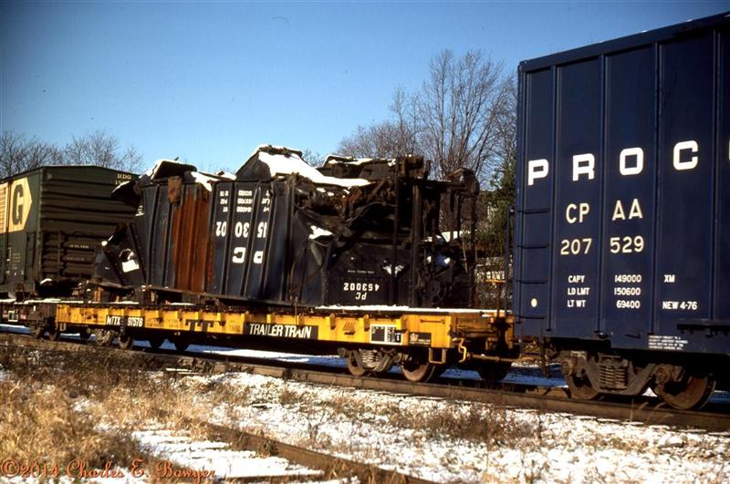 Re: Trains on this day in the past: - FiatFan - 12-21-2015 Had to look twice at that one. The building in the background looked like a photo backdrop. With the (apparently) empty cab and even the air hoses looked right for a model. Tom Re: Trains on this day in the past: - Charlie B - 12-22-2015 Caught this load in December, 1977, evidently they were still cleaning up the wreck of the Penn Central