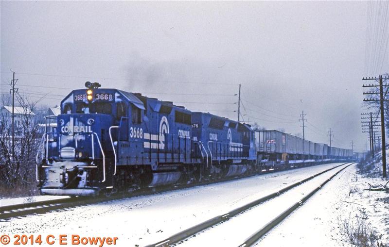 Re: Trains on this day in the past: - Charlie B - 12-23-2015 12/23/2003 Still deck out for Christmas. Schenley, Pa. Kiski Junction RR. ALCo S-1 Charlie Re: Trains on this day in the past: - bdw9535 - 12-23-2015 A pair of CSX engines make up MI-21 at Millville yard on December 23, 2010. Bruce Re: Trains on this day in the past: - Charlie B - 12-26-2015 Local CA1 heads west at Esterly Road, just west of Columbiana, Ohio December, 1977 Charlie Re: Trains on this day in the past: - Charlie B - 12-27-2015 12/27/2014, Beaver Falls, Pa 3rd street at the river, next to a small hydro plant where I was employed as operator from the time it was conceived in 1983 until it was sold in 1994. That led to my finally getting the railroad job I had wanted all my life.[attachment=0]20141227 CSX 7739 Beaver Falls 019.jpg Charlie Re: Trains on this day in the past: - Charlie B - 12-28-2015 Looking back over the train from the Allegheny Ludlum Bagdad (Pa.) plant. The storage tanks are just visible. 12/28/1997 Charlie Re: Trains on this day in the past: - bdw9535 - 12-29-2015 Winchester and Western GP9 520 heads up its train along the Vineland Industrial Track, Vineland, NJ December, 29, 2008. Bruce Re: Trains on this day in the past: - bdw9535 - 12-30-2015 Winchester and Western crosses the old CNJ diamond at Vineland, NJ on December 30, 2010. Bruce Re: Trains on this day in the past: - bdw9535 - 12-31-2015 Winchester and Western at Millville, NJ December 31, 2012. Bruce Re: Trains on this day in the past: - bdw9535 - 01-01-2016 Pavonia Yard, Camden, NJ January 1, 2015. Bruce Re: Trains on this day in the past: - Charlie B - 01-01-2016 This little bit of snow on Jan 1, 1978 was just a coming attraction for a very nasty winter, second in a row for us. A trailer train heading east at New Galilee, Pa. Re: Trains on this day in the past: - bdw9535 - 01-02-2016 Shore Fast Line's team track at Winslow, NJ January 1990. Bruce Re: Trains on this day in the past: - Charlie B - 01-02-2016 January 2, 1977 at Rochester, Pa. Charlie |