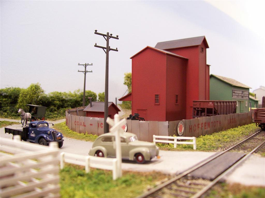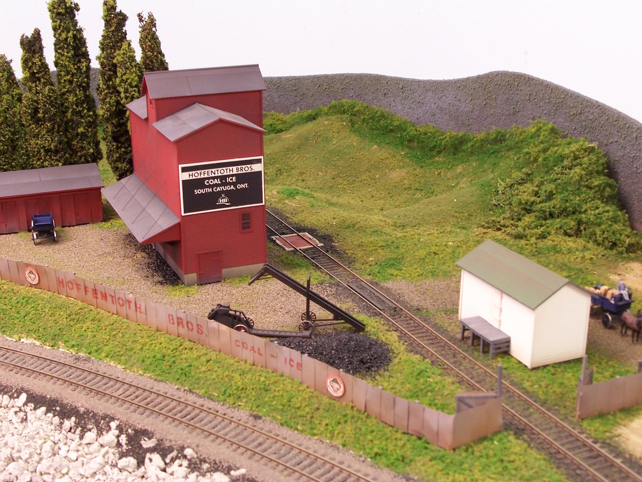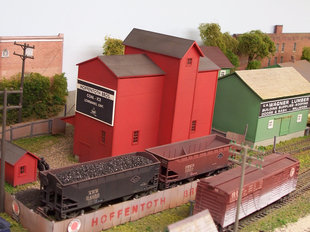 Selling Pennsylvania by the pound... - doctorwayne - 04-19-2009 … along with West Virginia, Kentucky, Illinois, and any other place where part of the real estate is made-up of coal. In the time frame that many of us model, up to the late 1950's, commercial coal dealers were found in all large cities and most small towns, as most homes and businesses were heated by coal furnaces. Movement of this commodity was an important source of revenue for the railroads, and as such, can be an important source of traffic for our model railroads. A coal dealer can be an operation as simple as a gas-powered elevator on a teamtrack, or as elaborate as banks of concrete siloes, either one using wagons or trucks to deliver the coal. While businesses and factories might buy their fuel by the ton or by the truckload, many home deliveries consisted of a few 100 pound bags at a time. Here are a few photos that may give you some ideas for a way to include this common industry on your layout. Hoffentoth Bros. Coal & Ice has an outlet in every town and city on my layout, even though not all are modelled. Because coal was in large part a seasonal commodity, most coal dealers supplemented their income by offering other products in the off-season. Ice, for home iceboxes, or even commercial uses, was a common choice, as were sand and gravel, or lumber and building supplies. Many of Hoffentoth's locations also included ice houses. Both the coal bins and the icehouses were usually built to a common plan for small towns, while larger towns and cities would have a design appropriate to the location. In Elfrida, both are located on the same siding. In the summer, ice would arrive in ice service reefers, shipped from a central storage facility, and be transferred to the local icehouse. From here it would be delivered to customers around town by truck or horse-drawn wagon. In the winter, most of the rail traffic on this siding would be hoppers full of either Anthracite or soft coal, which would be dumped into a pit under the track. Here, the pit is covered by steel plates which are lifted out of the way before the hopper doors are opened. The coal drops into the pit, then is lifted into the storage bins by an elevator inside the bin building. Inside the storage area are several pockets where the various types and sizes of coal are kept separate. Here's a view of the Lowbanks branch. The icehouse here is in a different part of town, as it's the main storage facility that ships ice to all of the smaller towns on the layout. The small building is the office, and the overhanging roof on the side away from the tracks is above the chutes used for loading the trucks. The yards are fenced to keep the area secure and to prevent pilferage: This view of the South Cayuga yard shows the truck-loading side of the building, with the chutes beneath the canopy: And a truck leaving to make some deliveries: Hoffentoth Bros. don't have a monopoly on the coal business around here, though. Hoffentoth's yard in Dunnville is not modelled, but that of their competitor, Creechan’s Fine Fuels, is. Here's their head office, on Liberty Street: And a view through their main gate, into the yard: This shot shows a couple of hoppers being spotted on the dump track, elevated and rebuilt extensively when the Grand Valley's then-parent NYC completed a grade-separation project through downtown Dunnville in the mid-20's: A peek inside the dumpshed: Here's an aerial view of the yard, courtesy of Barney Secord's Crop Dusting and Aerial Photography Services. The driver of the truck on the left is in the scalehouse, centre, getting his paperwork. The truck on the right is being loaded with gravel by a crew with shovels and a gas-powered elevator: A truck, ready to take out a delivery: And a final look: I hope that these views of some coal dealerships on my layout will encourage you to include your own version of this interesting industry on your layout. Wayne Re: Selling Pennsylvania by the pound... - shaygetz - 04-19-2009 Wow... Re: Selling Pennsylvania by the pound... - cn nutbar - 04-19-2009 Hi Doc---for a second ,I thought you we're talking about the Flyers and Penguins hockey game --- great pictures and story regarding a hot commodity on the EG&E---often double-headers were required to move those black diamonds---here's a shot from the past showing a couple of CNR 2-10-2's crossing the Speed River with a long train of solid hoppers