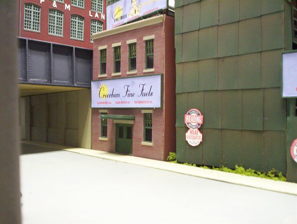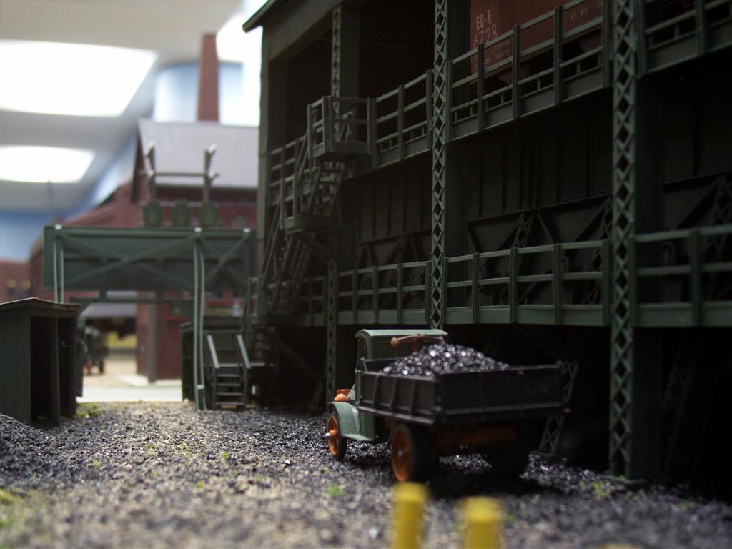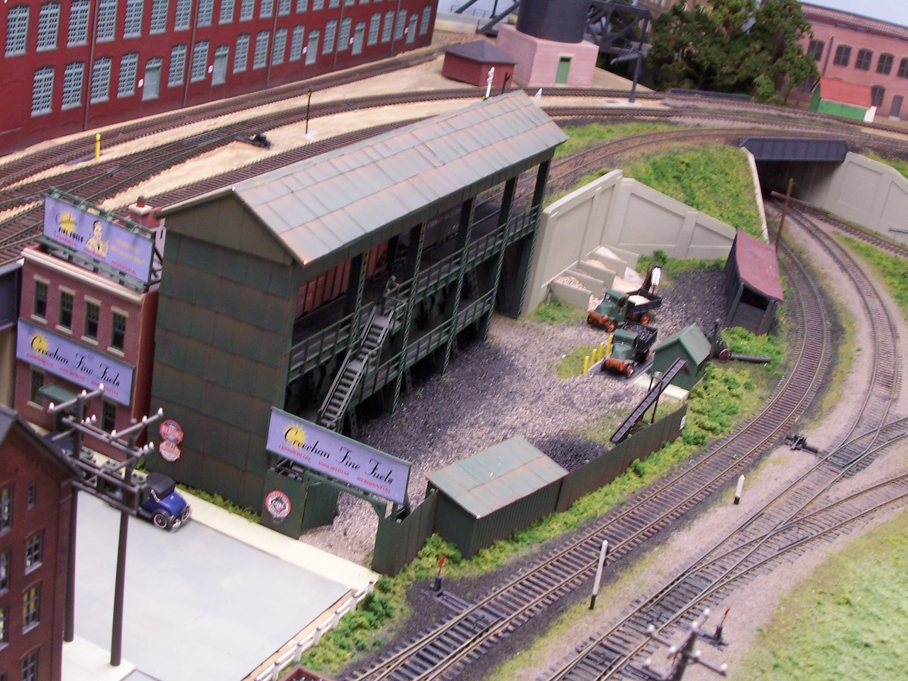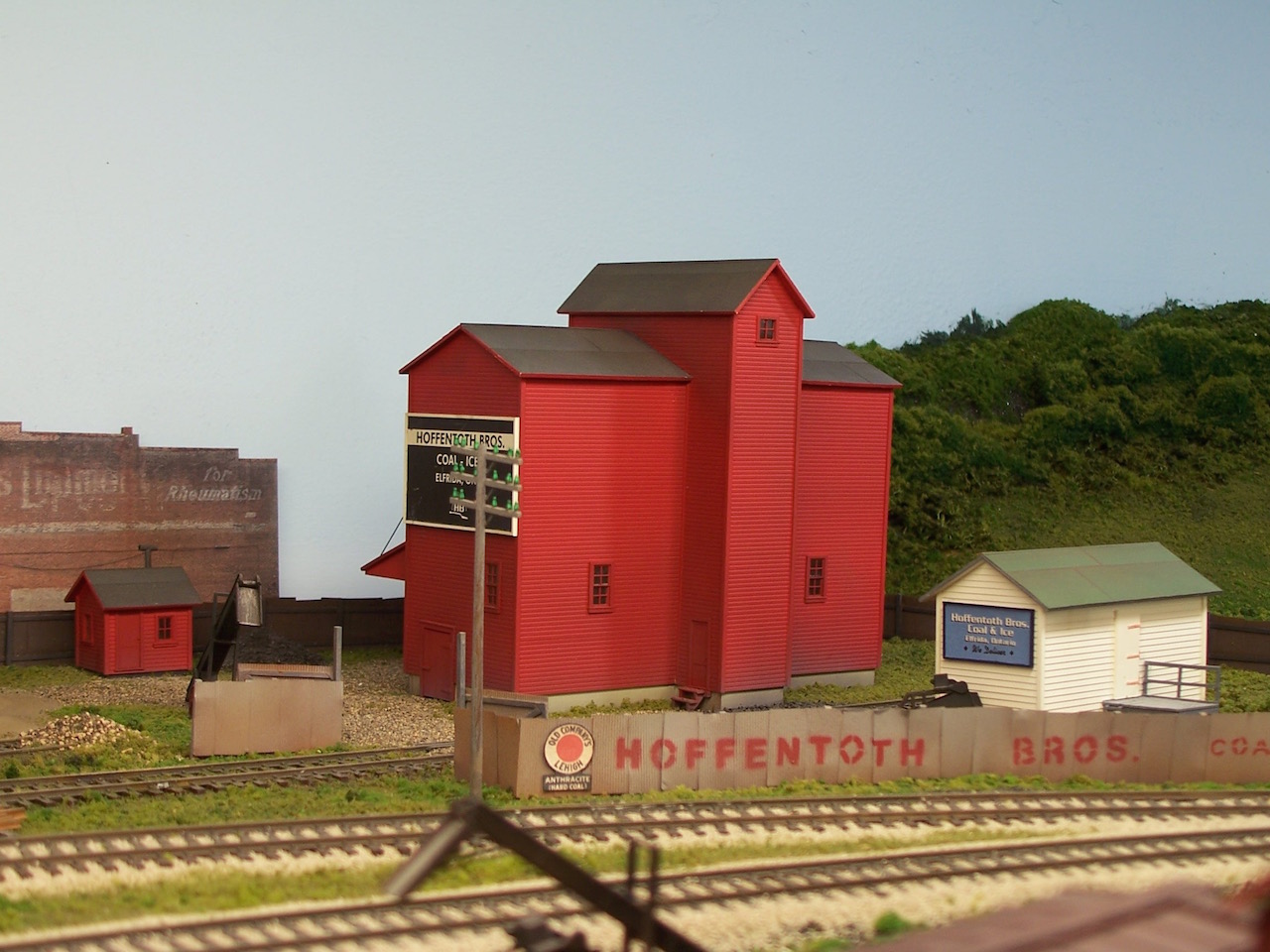 Selling Pennsylvania by the pound... - doctorwayne - 04-19-2009 … along with West Virginia, Kentucky, Illinois, and any other place where part of the real estate is made-up of coal. In the time frame that many of us model, up to the late 1950's, commercial coal dealers were found in all large cities and most small towns, as most homes and businesses were heated by coal furnaces. Movement of this commodity was an important source of revenue for the railroads, and as such, can be an important source of traffic for our model railroads. A coal dealer can be an operation as simple as a gas-powered elevator on a teamtrack, or as elaborate as banks of concrete siloes, either one using wagons or trucks to deliver the coal. While businesses and factories might buy their fuel by the ton or by the truckload, many home deliveries consisted of a few 100 pound bags at a time. Here are a few photos that may give you some ideas for a way to include this common industry on your layout. Hoffentoth Bros. Coal & Ice has an outlet in every town and city on my layout, even though not all are modelled. Because coal was in large part a seasonal commodity, most coal dealers supplemented their income by offering other products in the off-season. Ice, for home iceboxes, or even commercial uses, was a common choice, as were sand and gravel, or lumber and building supplies. Many of Hoffentoth's locations also included ice houses. Both the coal bins and the icehouses were usually built to a common plan for small towns, while larger towns and cities would have a design appropriate to the location. In Elfrida, both are located on the same siding. In the summer, ice would arrive in ice service reefers, shipped from a central storage facility, and be transferred to the local icehouse. From here it would be delivered to customers around town by truck or horse-drawn wagon. In the winter, most of the rail traffic on this siding would be hoppers full of either Anthracite or soft coal, which would be dumped into a pit under the track. Here, the pit is covered by steel plates which are lifted out of the way before the hopper doors are opened. The coal drops into the pit, then is lifted into the storage bins by an elevator inside the bin building. Inside the storage area are several pockets where the various types and sizes of coal are kept separate. Here's a view of the Lowbanks branch. The icehouse here is in a different part of town, as it's the main storage facility that ships ice to all of the smaller towns on the layout. The small building is the office, and the overhanging roof on the side away from the tracks is above the chutes used for loading the trucks. The yards are fenced to keep the area secure and to prevent pilferage: This view of the South Cayuga yard shows the truck-loading side of the building, with the chutes beneath the canopy: And a truck leaving to make some deliveries: Hoffentoth Bros. don't have a monopoly on the coal business around here, though. Hoffentoth's yard in Dunnville is not modelled, but that of their competitor, Creechan’s Fine Fuels, is. Here's their head office, on Liberty Street: And a view through their main gate, into the yard: This shot shows a couple of hoppers being spotted on the dump track, elevated and rebuilt extensively when the Grand Valley's then-parent NYC completed a grade-separation project through downtown Dunnville in the mid-20's: A peek inside the dumpshed: Here's an aerial view of the yard, courtesy of Barney Secord's Crop Dusting and Aerial Photography Services. The driver of the truck on the left is in the scalehouse, centre, getting his paperwork. The truck on the right is being loaded with gravel by a crew with shovels and a gas-powered elevator: A truck, ready to take out a delivery: And a final look: I hope that these views of some coal dealerships on my layout will encourage you to include your own version of this interesting industry on your layout. Wayne Re: Selling Pennsylvania by the pound... - shaygetz - 04-19-2009 Wow... Re: Selling Pennsylvania by the pound... - cn nutbar - 04-19-2009 Hi Doc---for a second ,I thought you we're talking about the Flyers and Penguins hockey game --- great pictures and story regarding a hot commodity on the EG&E---often double-headers were required to move those black diamonds---here's a shot from the past showing a couple of CNR 2-10-2's crossing the Speed River with a long train of solid hoppers