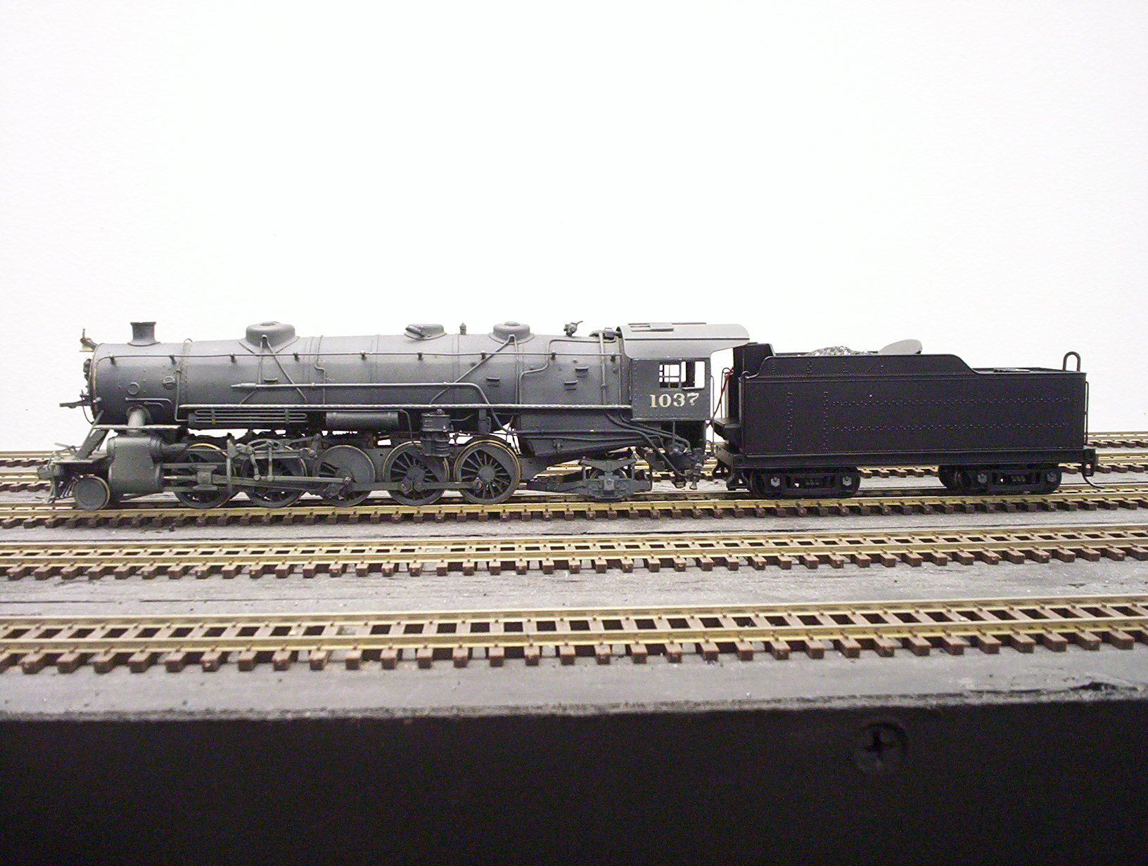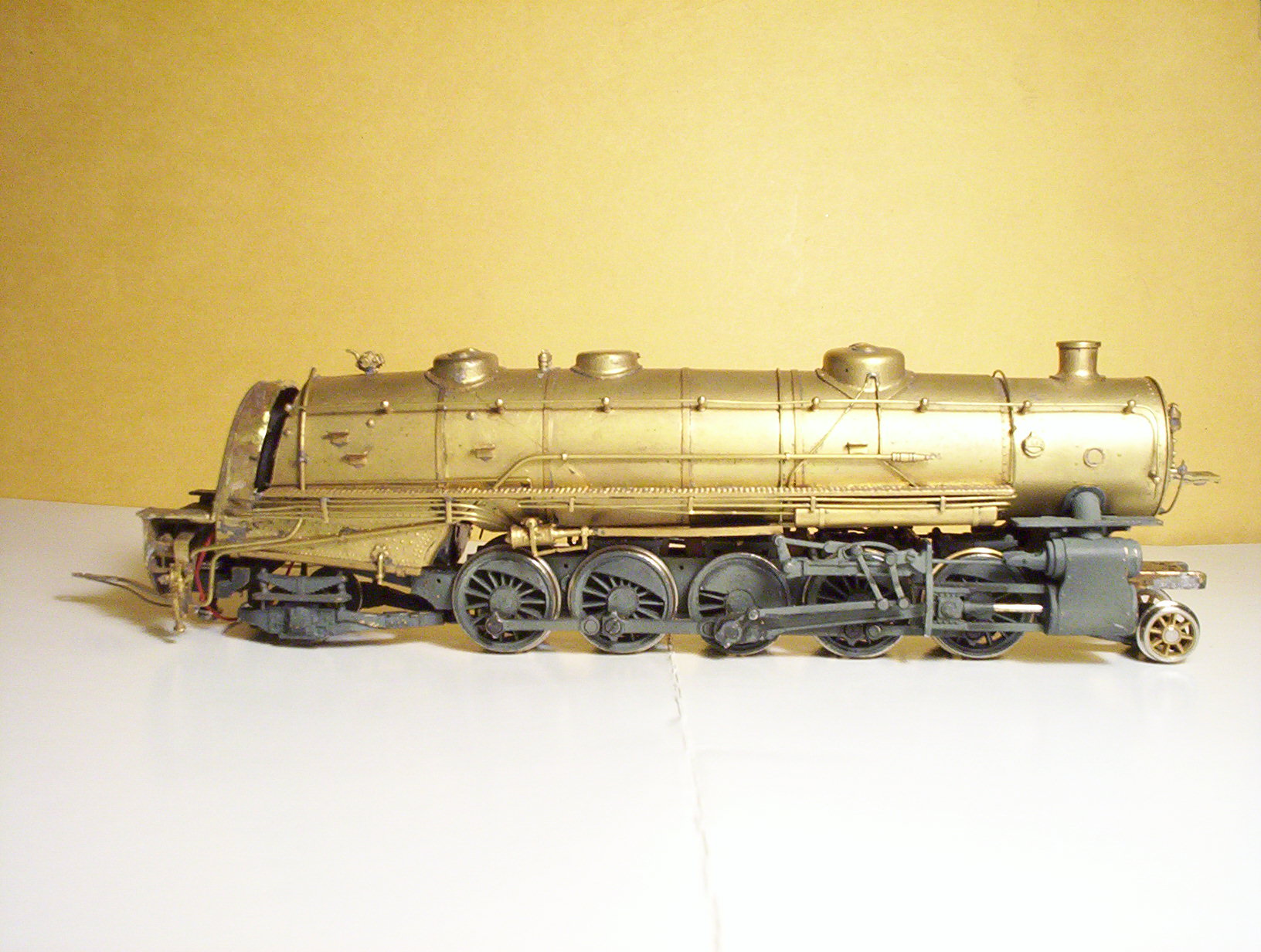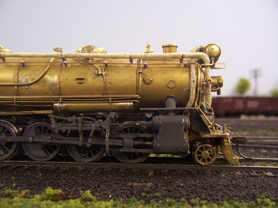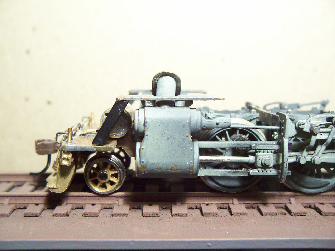 Building Beeg Boy...(with LOTS of pictures) - doctorwayne - 12-23-2008 …and Union Pacific fans shouldn’t get too excited, as that is neither a spelling error nor anything to do with that road’s largish articulated locos. Several years ago, my good friend cn nutbar was musing about the possibility of having me create a model of one of the CNR’s T-3-a locomotives. These were ten USRA Light 2-10-2s acquired, second-hand, from the Boston & Albany in 1928, not too long after that road had received their noteworthy A-1 Class 2-8-4s. He had an article in the CN Lines magazine of the CNR sig that gave a short history of the locos, along with some photos of the prototype and a pair of photos of a nicely-done model by John Williams, using an old Akane USRA 2-10-2 - not a model that you come across too often these days. I felt that if we could find a suitable loco to start with, it could be done. Bowser offered a 2-10-2, but the wheelbase was too far off, and the entire boiler was wrong. The only other 2-10-2s available were in brass, and not too plentiful even then. The topic of this loco would come up periodically, and I joked that if we ever did get started, as soon as we had acquired the loco, at least one manufacturer would immediately release a suitable 2-10-2, and at a reasonable price, too. This actually happened: Bachmann came out with a USRA Light 2-10-2 a year or so after the project got underway, followed by another, less suitable but useable, version from IHC. Anyway, I was in a hobby shop one day and they had (gasp!) a used Akane USRA Heavy 2-10-2. I had always felt that their version of the “Heavy” looked closer to what we wanted, so I called Mister Nutbar to apprise him of my discovery, and the loco was quickly purchased. While it was painted and lettered for a free-lance railroad, and had the incorrect “Long” tender (with a water scoop, no less!), it had also been remotored with a large Sagami can motor and ran very well. On its first test run on my layout, it made a trouble free loop almost around the room, but as it exited the lift-out bridge across the entrance to the layout and headed into the curve between the buildings of GERN Industries, the lead set of drivers derailed. However, loco and train continued on, unfazed by what appeared to be imminent disaster. At the first turnout, and without hesitation or faltering, the wheels re-railed themselves, and the loco and train carried on as if nothing had happened. “That’s some loco”, I commented, “It’s a real ‘Beeg Boy’ - nothing bothers it!”. From that point on, we referred to the loco as “Beeg Boy”. It took some time to acquire all of the parts necessary for the conversion work, but I finally got started on the project. Some things were pretty straightforward, while others, such as the ash chutes under the firebox, had me stumped for a while. The whole project, not too far advanced, ground to a halt for a year while I did a house renovation for someone, followed by almost another year that I just couldn’t get any enthusiasm for this job. I tinkered with it off and on, and finally the fire was re-kindled. From that point on, work went rather quickly, and the solutions to problems seemed to come easily. I kept making excuses to Mister Nutbar that the project was still stalled, though, as I was worried that I’d “run out of gas” before I got done. That, fortunately, didn’t happen, and today , when he arrives here to pick up two other locomotives that I’ve repainted for him, I hope that he’ll be pleasantly surprised when I also reveal the finished results of this long-delayed project. What follows is not a “how-to”, but rather a chronicle of the construction process. This is a scan of a page from the October 1983 issue of Mainline Modeler, showing one of the prototypes of the loco that we’re hoping to end-up with. The photo is from the Charles T. Felstead Collection. Here’s the loco as we found her, although the original tender is not shown. It’s in the paint stripper, while the tender shown is the Bachmann replacement that I’m going to modify for use with this loco. One of my first tasks was to cast a new boiler weight from lead, as the original was too small. With the large can motor, the loco was severely back-heavy. (Probably the reason why those lead drivers derailed.) After stripping the paint from the loco, I used a propane torch to remove the original cab and pilot from the loco. The original wheelset in the lead truck was replaced with a spoked set from PSC, then I used a cut-off disk in my Dremel to cut a slot in the boiler in preparation for the installation of the new cab. The new cab, an old Kemtron cast brass kit, was picked up in a box of train goodies bought by my wife at a garage sale for $5.00. (There was a lot of other neat stuff in that box, too -a real find!) I assembled it using the torch, then used the torch again to attach it firmly to the loco. Here’s the running gear as found. The trailing truck is missing part of the equaliser on this side, and the original pilot wheels are still in place. One of the distinctive details of this loco are the ash chutes under the firebox. I used square brass tubing, soldered to the loco’s frame, for the main chutes, then fabricated the doors from styrene and wire. Unfortunately, they are not as solid as they might have been had I used brass, but with 19 pieces per door, I felt that they were beyond my capabilities with a soldering iron. I did fabricate the missing part for the trailing truck and soldered it in place. I fabricated a new pilot deck, altered the frame, then modified a brass CNR-style pilot to accommodate a Kadee coupler. (Mister Nutbar had bought a number of these from a brass importer some years ago - this is the last one that we have.) Everything was soldered together using a 200 watt iron, then the coupler lift bar and stanchions, flag holders and a new air tank (built from lead-filled brass tu